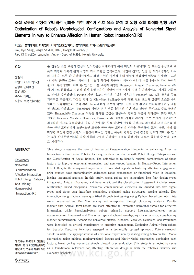 주제: 소셜 로봇의 감성적 인터랙션 강화를 위한 비언어 신호 요소 분석 및 외형 조합 최적화 방향 제안