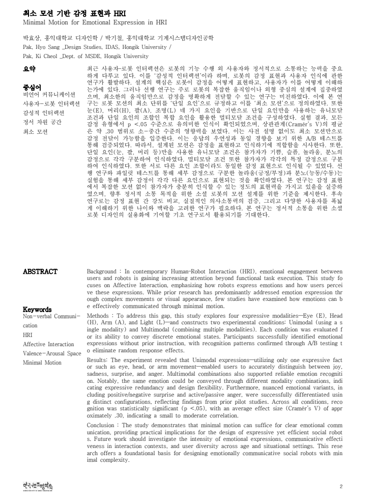 본 연구는 인간–로봇 인터랙션(Human–Robot Interaction, HRI)에서 최소한의 움직임을 활용하여 감정을 표현하고 사용자가 이를 인식할 수 있는 가능성을 실증적으로 검증하는 데 목적이 있다. 최근 로봇은 단순히 기능적 작업을 수행하는 것을 넘어, 정서적 유대 형성과 소통을 통해 사용자와 교감하는 감성적 인터랙션(Affective Interaction)의 중요성이 강조되고 있다. 로봇이 감정을 효과적으로 표현하고 사용자가 이를 사회적 신호로 받아들일 수 있는지는 인터랙션의 품질을 결정하는 핵심 요소이며, 이는 로봇 디자인 및 설계에서 매우 중요한 연구 과제이다. 기존 연구들은 주로 복잡한 움직임이나 외형적 요소, 다채로운 모션 조합을 활용한 감정 표현에 집중해 왔다. 그러나 이러한 방식은 구현 비용이 크고 해석의 일관성을 담보하기 어렵다는 한계가 있으며, 최소한의 움직임으로 감정을 효과적으로 전달할 수 있는 가능성은 충분히 탐구되지 않았다. 이에 본 연구는 로봇 모션의 가장 작은 단위인 ‘단일 요인’을 최소 모션(minimal motion)으로 정의하고, 이 최소 모션이 감정 표현 및 인식 과정에서 갖는 효용성을 실증적으로 검증하였다.