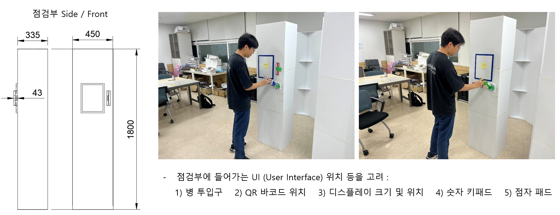 연구 과정에서는 실제 사용자의 접근성과 편의성을 검증하기 위한 1:1 스케일의 Low-fidelity 프로토타입이 제작되었습니다. 팀은 ‘사이즈 코리아(Size Korea)’의 인체치수 데이터를 기반으로 디스플레이 위치, 손 닿는 높이, 병 투입구의 각도 등을 세밀하게 조정하고, 휠체어 사용자와 시니어 사용자를 대상으로 테스트를 진행했습니다. 이를 통해 누구나 자연스럽게 기기를 사용할 수 있는 인터페이스와 물리적 구조를 완성하였으며, 특히 손의 위치, 화면 가독성, 접근 각도 등 세부적인 인간공학적 데이터를 반영하여 완성도를 높였습니다.
