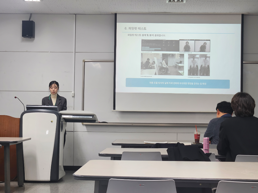 발표 논문 주제는 “유니버설 디자인 설계 기반의 에어방석 개발 연구 — 자동 공기압 조절 시스템을 통한 착석 자세 보정”이었습니다. 본 연구는 휠체어 사용자가 장시간 착석할 때 겪는 체압 집중, 자세 붕괴, 욕창 위험 등의 문제를 완화하기 위해, 유니버설 디자인(UD) 원칙을 설계 기준으로 삼아 자동 공기압 조절형 에어방석을 개발하는 것을 목표로 합니다. 이를 위해 척수손상, 소아마비, 신경손상 등 다양한 장애 유형의 사용자를 대상으로 FGI와 심층 인터뷰를 수행했고, 그 결과 체간 전방 쏠림, 압박 부위 인지 어려움, 체위 조정의 한계와 같은 공통 페인포인트를 도출했습니다. 특히 사용자들은 “자세가 무너지는 순간을 스스로 인지하지 못한다”, “체위 변경이 어렵기 때문에 동일 자세가 누적된다”, “불편이 생겨도 어디가 압박되는지 스스로 판단하기 어렵다”와 같은 경험을 반복적으로 언급했는데, 이는 단순한 체압 수치만으로는 충분히 포착되지 않는 중요한 문제로 판단되었습니다.