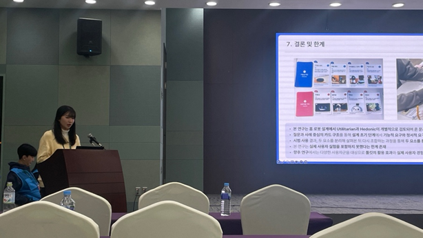 저의 발표는 홈 로봇의 지속적 수용을 위해 기능적 효용과 정서적 즐거움을 통합적으로 고려하는 U&H 설계 툴킷 제안을 주제로 진행되었습니다. 본 연구는 로봇이 실질적 도움(Utilitarian)과 감성적 만족(Hedonic) 중 어느 한 축이라도 부족할 경우 장기 사용으로 이어지기 어렵다는 문제의식에서 출발하였습니다. 이를 해결하기 위해 두 가치의 개념을 체계화하고, 초기 기획 단계에서 디자이너와 엔지니어가 이를 시각적으로 검토할 수 있는 실용적 도구를 개발하는 데 초점을 두었습니다.