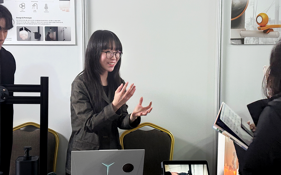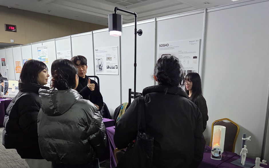 저희 팀은 이미지 스키마에 기반한 피지컬 인터랙티브 조명 디자인을 통해, 시각적 색온도 경험으로 사회적 온기를 전달할 수 있는 조명 디자인을 제안하였습니다. 전시 기간 동안 SOSHO의 프로토타입을 설치하여 관객들이 직접 핸들을 돌려보며 빛을 조작하는 경험을 제공하였고 디자인에 담긴 인지 심리학 이론과 실험 과정, 그리고 프로젝트의 의의를 설명하며 작품을 선보였습니다. 이 과정에서 관람객들과 소통하며 연구를 발전시킬 수 있는 귀중한 피드백을 얻을 수 있었습니다. 특히 통계적 유의성 확보를 위해 실험 보상의 가치를 상향 조정해볼 필요가 있다는 조언과, 실제 샤워기에 해당 조명을 접목하여 실용성을 강화해 보라는 제안이 인상적이었습니다. 향후 연구 방향에 대한 아이디어를 나눌 수 있어 뜻깊은 시간이었습니다.