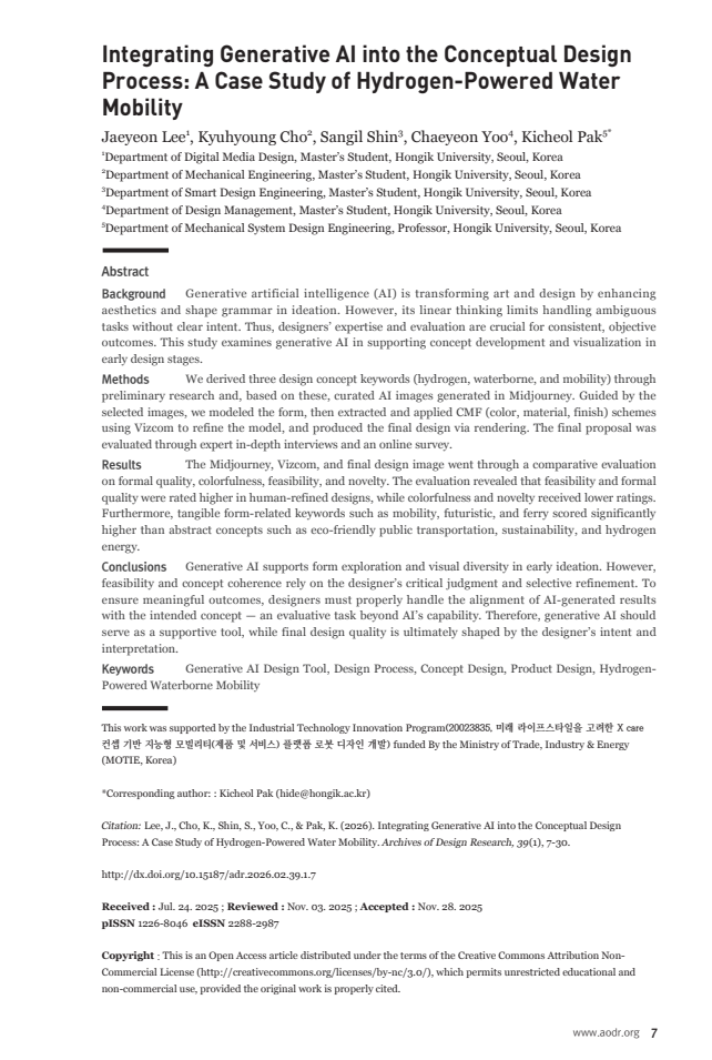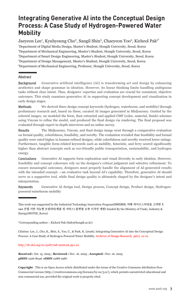 This study examines how integrating generative AI into the early stages of conceptual design changes ideation and visualization, and what is required for AI-generated outcomes to evolve into a feasible, coherent final design, using a hydrogen-powered water mobility system (Han River public water transport) as a case study. The authors first investigate the context of Han River water transit—its environment and infrastructure—along with domestic and international 사례 of water buses and ferries, and the constraints of hydrogen propulsion systems, particularly how the volume and placement of storage tanks can shape the vessel’s form. Based on this groundwork, they derive the concept keywords hydrogen–waterborne–mobility and use them as the backbone of the design direction. They then generate roughly 300 images with Midjourney while iteratively refining prompts, observing that outputs can fluctuate widely even under the same keywords and that terms such as “hydrogen” can bias results toward tank-like forms rather than coherent vessel configurations. The study documents how prompt adjustments are used to mitigate such distortions and gradually converge from speculative imagery toward realistic scale, structural logic, and an industrial form language.