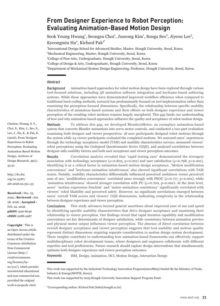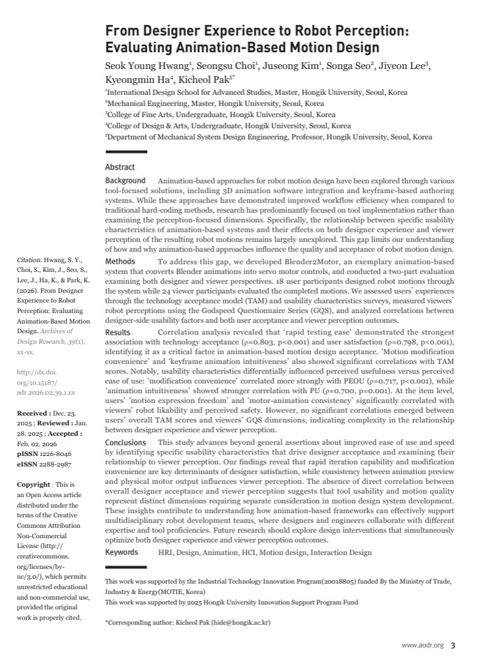 This study aims to quantitatively examine how animation-based robot motion design influences designers’ technology acceptance and how it relates to observers’ perceptions of the robot. To this end, the authors developed an animation-to-actuation workflow (Blender2Motor) that converts keyframe animations created in Blender into servo-motor control for real robot playback. The pipeline covers bone-to-motor mapping, Bézier-curve timing control via the Graph Editor, motor parameter settings, exporting keyframe data, executing motion on the robot, and visualizing discrepancies by comparing target positions with actual motor positions.