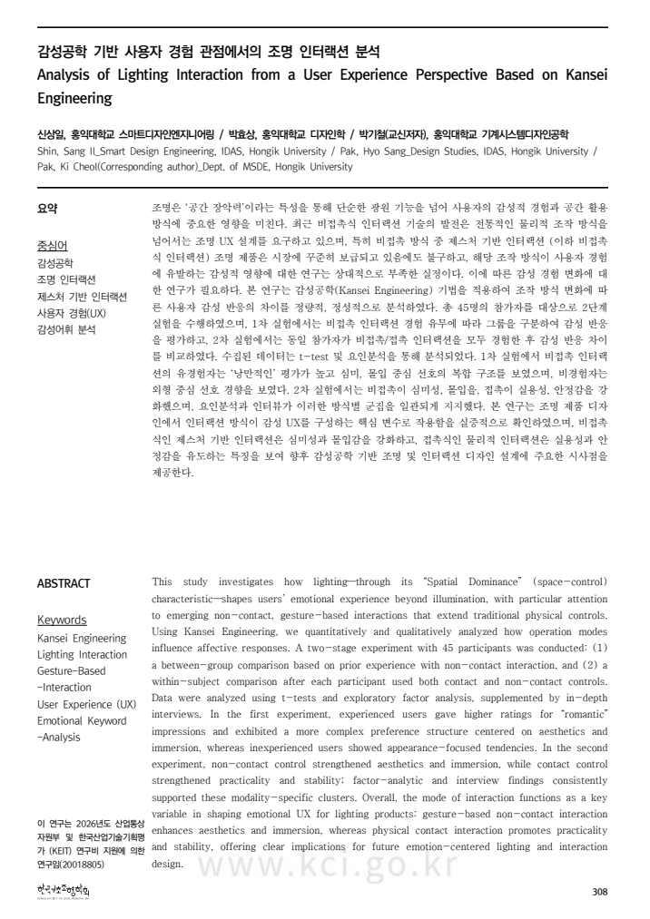 본 연구는 감성공학(Kansei Engineering) 관점에서 조명의 인터랙션 방식이 사용자 경험과 감성적 인상 형성에 어떠한 차이를 유발하는지를 실증적으로 분석한 논문이다. 연구의 출발점은 조명이 단순히 공간을 밝히는 기능적 광원을 넘어, 공간 분위기와 사용자의 정서적 경험을 형성하는 중요한 매개체라는 인식에 있다. 특히 최근 스마트 조명 기술의 확산과 함께 손 제스처를 활용한 비접촉식 조작 방식이 등장하면서, 기존의 버튼·다이얼·터치 기반 접촉식 인터랙션과는 다른 사용자 경험을 제공하고 있음에도, 이러한 조작 방식의 차이가 실제로 어떤 감성적 반응의 차이를 만들어내는지에 대한 연구는 충분하지 않았다. 이에 본 연구는 조명 조작 방식의 변화가 심미성, 몰입감, 실용성, 안정감과 같은 감성 UX 요소에 어떤 영향을 주는지를 체계적으로 규명하고자 하였다.