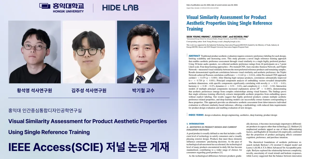 HIDE Lab(인간로봇상호작용디자인공학연구실)의 연구성과가 IEEE Access(SCIE) 저널에 게재되었습니다. 이번 논문은 황석영 석사연구원, 김주성 석사연구원이 함께 수행한 연구로, 논문 제목은 “Visual Similarity Assessment for Product Aesthetic Properties Using Single Reference Training”입니다.