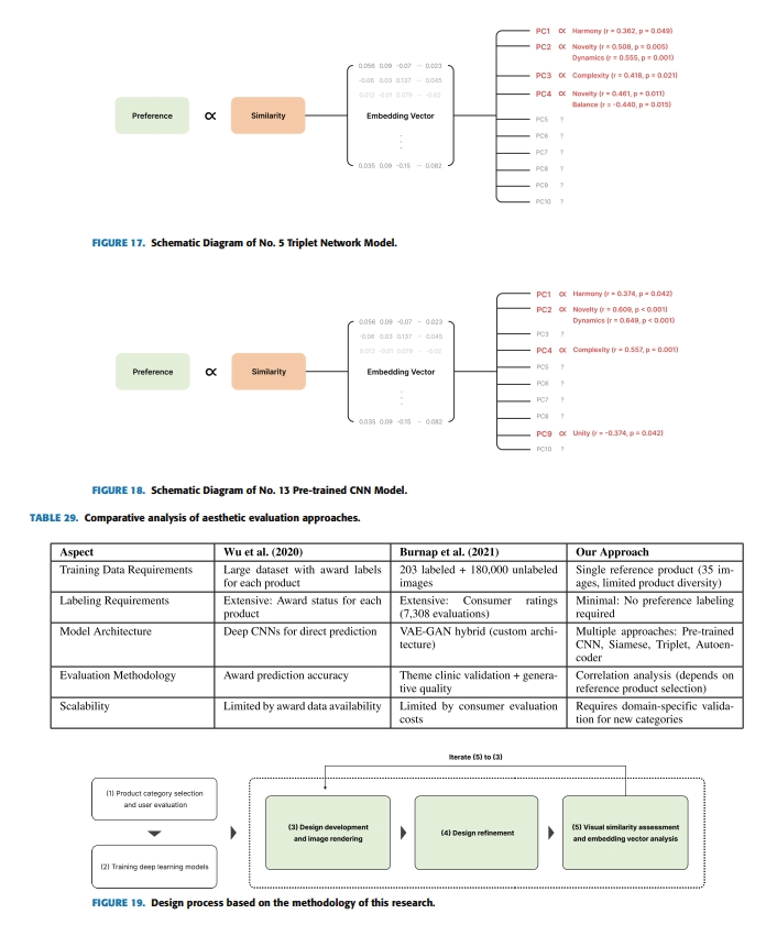 본 연구는 제품의 심미적 평가가 전통적으로 많은 수의 선호도 라벨링 데이터를 필요로 하며 이로 인해 확장성과 비용 효율성에 한계가 있다는 문제의식에서 출발하였다. 연구진은 이를 해결하기 위해, 다수의 제품에 대한 라벨링 없이도 심미적 속성을 평가할 수 있는 새로운 방법으로서 단일 참조 학습(single reference training) 접근법을 제안하였다. 이 방법은 참가자들이 가장 선호한 제품 하나를 기준으로 삼고, 다른 제품들과의 시각적 유사성을 딥러닝 기반 모델을 통해 계산하여, 선호도와의 상관성을 추론하는 방식이다. 즉, 한 개의 참조 제품이 가진 시각적 특징을 중심으로 다른 제품들과의 유사도를 분석하고, 그 결과로 도출된 패턴이 미적 선호와 어떤 관계를 갖는지 규명하는 것이 핵심이다.