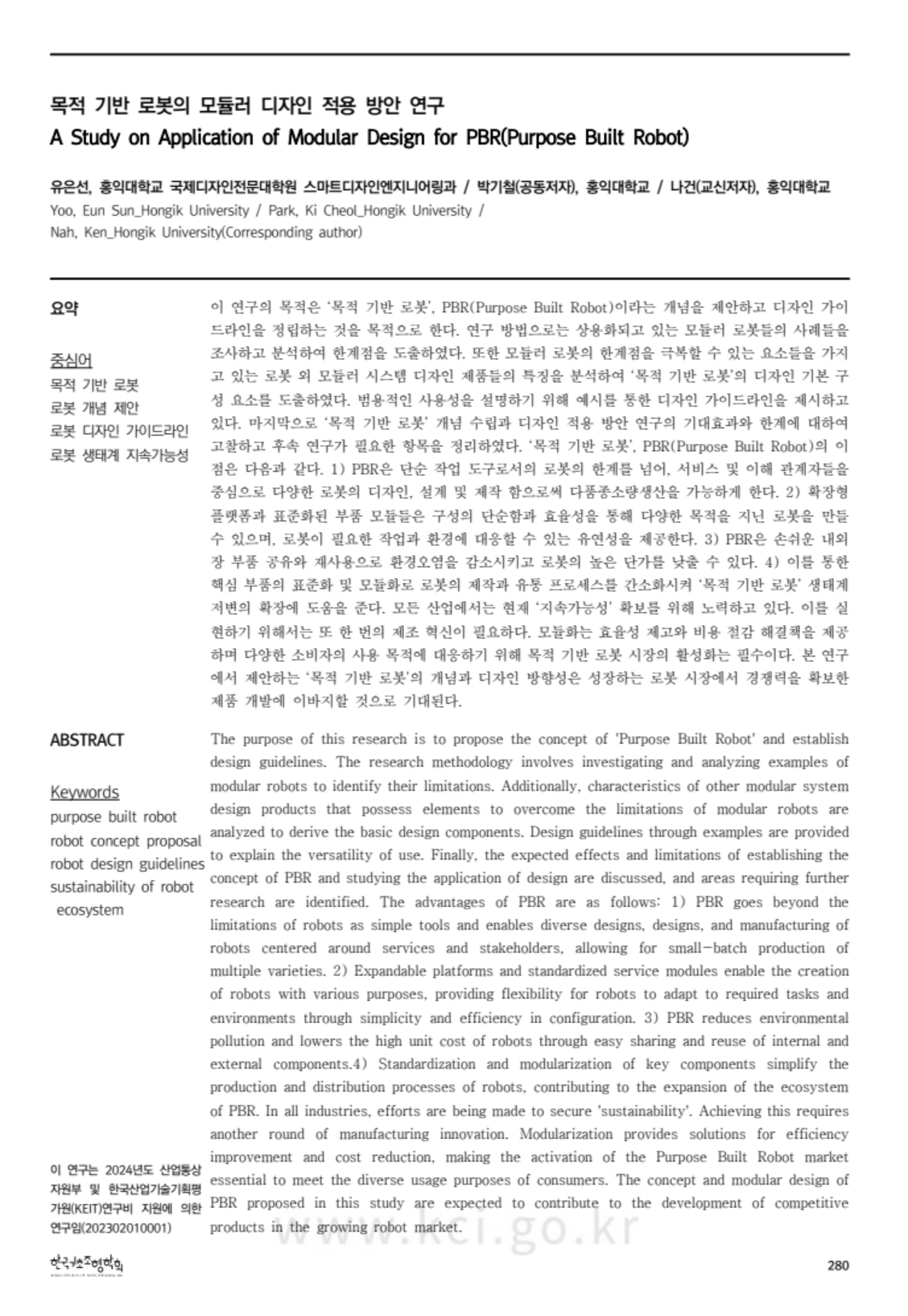 본 연구는 미래 로봇 시장에서 요구되는 새로운 제조 패러다임으로서 ‘목적 기반 로봇(Purpose Built Robot, PBR)’의 개념을 제안하고, 이를 구현하기 위한 모듈러 디자인 적용 방안을 탐구한다. 연구의 배경에는 저출산과 고령화, 인력 부족, 생산성 저하라는 사회적 문제와 더불어 서비스 로봇 수요의 급증이 있다. 기존의 로봇 시장은 수직 통합형 구조에서 수평 분업형 구조로 전환되고 있으며, 서비스로서의 로봇(RaaS) 개념이 확산되면서 다양한 목적을 충족할 수 있는 다품종 소량생산형 로봇의 필요성이 커지고 있다. 본 연구는 기존 모듈러 로봇 사례를 분석하여 한계를 도출하고, 이를 극복하기 위해 다른 산업의 모듈러 시스템 사례를 접목시켜 새로운 로봇 디자인 가이드라인을 제시하였다.