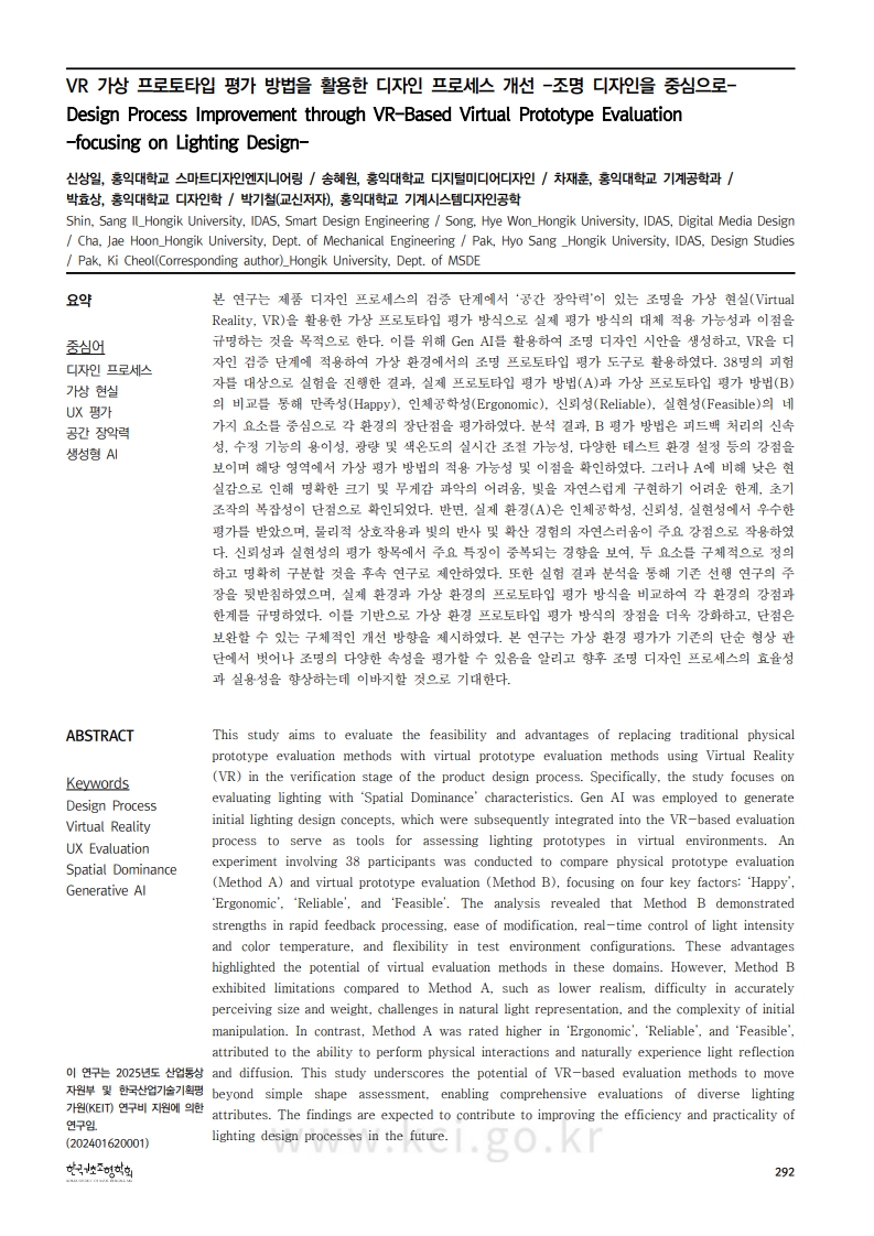 본 연구는 조명 디자인 프로세스에서 프로토타입 평가 단계를 개선하기 위해 가상현실(VR) 기반의 가상 프로토타입 평가 방식을 도입하여 실제 프로토타입 평가와 비교 분석한 것이다. 조명은 공간의 분위기와 사용자 경험에 직접적인 영향을 미치며, 색온도나 광량 조절에 따라 감정과 행동이 변화한다는 점에서 실시간 평가의 중요성이 강조된다. 이에 연구진은 ‘공간 장악력’을 핵심 개념으로 설정하고, VR 기술을 활용한 가상 프로토타입 평가가 기존 물리적 평가를 대체할 수 있는지 검증하고자 하였다.