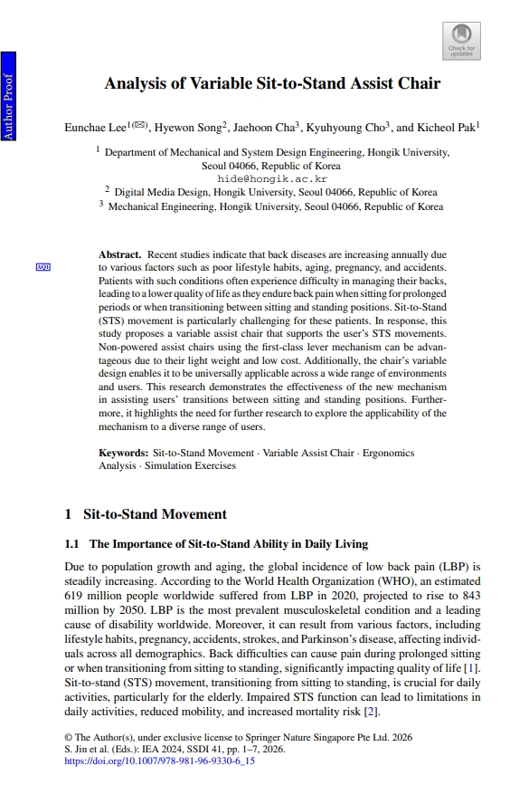 결론적으로, 제안된 가변 보조 의자는 비전동식 구조로 제작비와 유지비가 적으며, 사용자에게 맞춤형 보조 효과를 제공할 수 있다는 장점을 가진다. 이는 고령자나 허리 질환 환자뿐만 아니라 일반인에게도 활용 가능성이 있다. 연구진은 향후 무게 중심(COG) 이동 분석, 압력 센서 활용, 다양한 사용자군을 대상으로 한 실험 등을 통해 이 메커니즘의 타당성을 더욱 입증할 필요가 있다고 제안한다. 본 연구는 노화 사회에서 증가하는 STS 문제를 해결할 수 있는 실용적 대안을 제시했으며, 나아가 향후 보조 의자 설계의 새로운 가능성을 열어줄 수 있다는 점에서 학문적·실무적 의의가 크다.