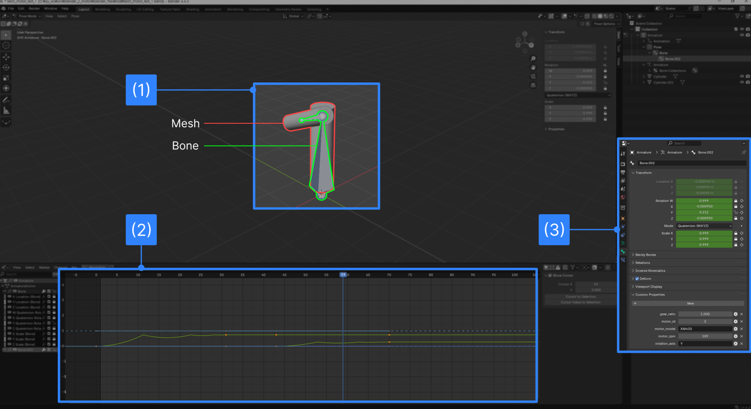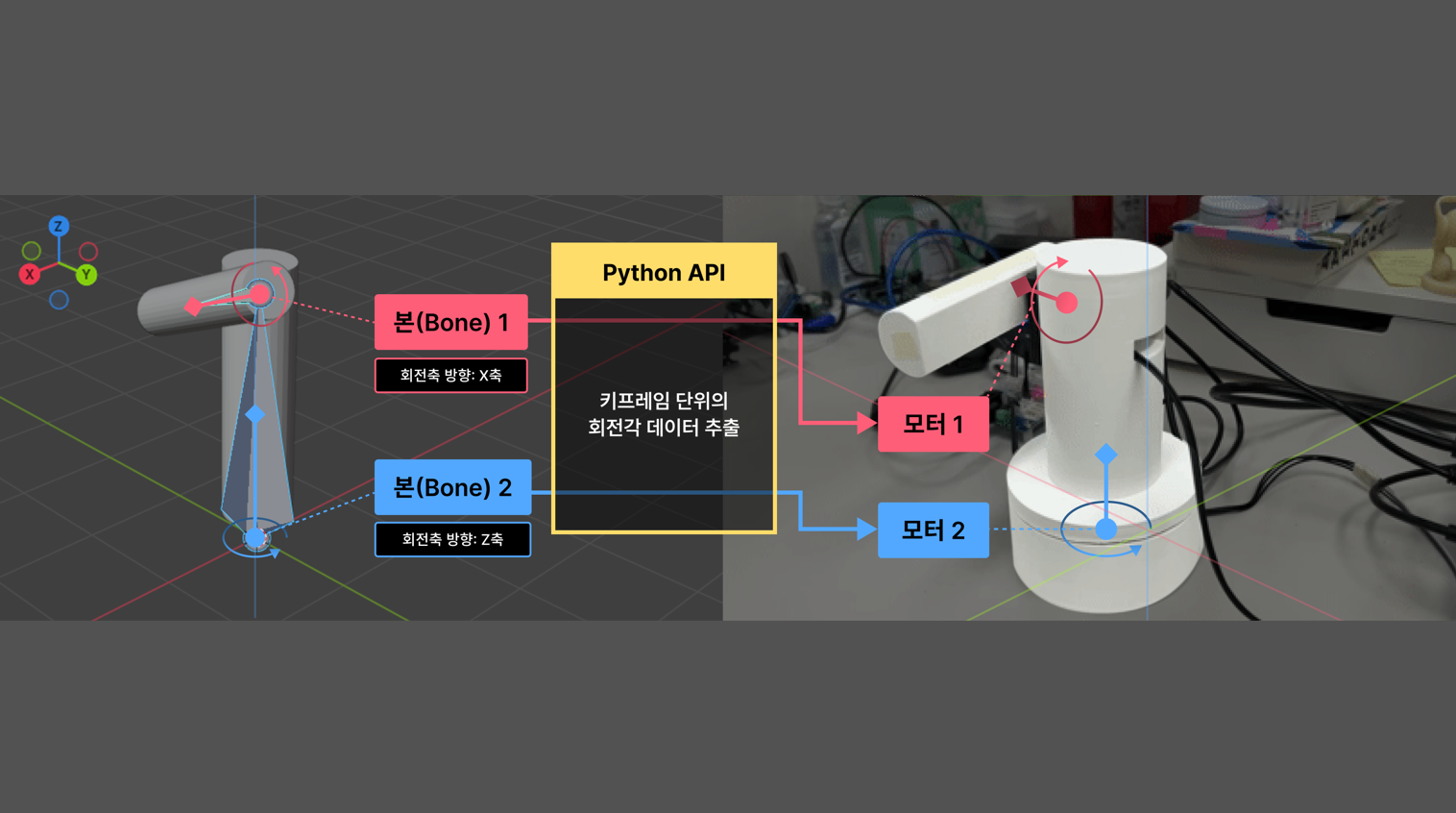 실제 시연에서는 Blender를 활용해 가상의 로봇을 리깅(Rigging)하고 애니메이션(Animation) 그래프를 설계하는 과정을 단계별로 소개했습니다. 황 연구원은 학생들에게 로봇 관절의 구조를 설계하고, 각 본(Bone)의 회전축을 설정한 뒤, 이를 Python 기반의 Dynamixel 모터로 직접 전송하는 과정을 보여주며, 디지털 애니메이션이 물리적 움직임으로 변환되는 메커니즘을 시각적으로 이해하도록 도왔습니다. 또한 Inverse Kinematics(IK) 시스템을 적용해 복합적인 움직임을 생성하고, 이를 Blender2Motor 환경에서 실시간으로 제어하는 데모를 진행해 학생들의 높은 관심을 끌었습니다.
