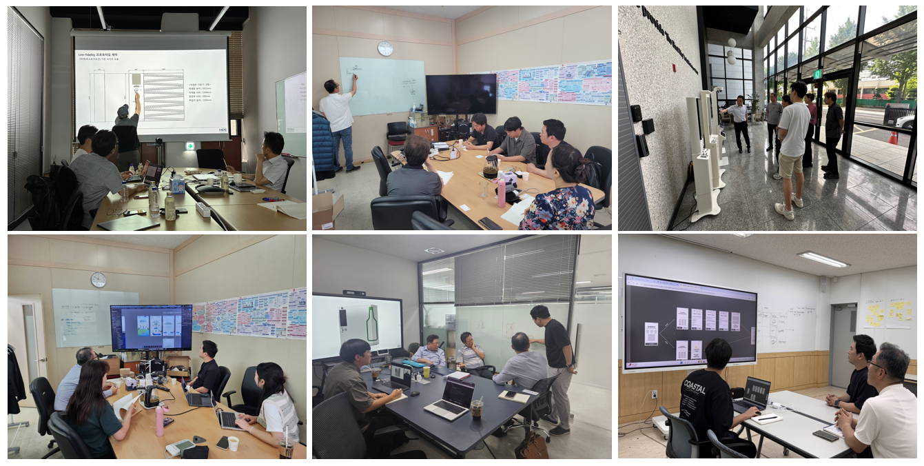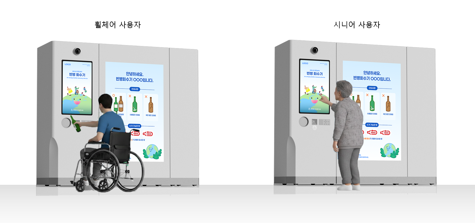 연구 과정에서는 실제 사용자의 접근성과 편의성을 검증하기 위한 1:1 스케일의 Low-fidelity 프로토타입이 제작되었습니다. 팀은 ‘사이즈 코리아(Size Korea)’의 인체치수 데이터를 기반으로 디스플레이 위치, 손 닿는 높이, 병 투입구의 각도 등을 세밀하게 조정하고, 휠체어 사용자와 시니어 사용자를 대상으로 테스트를 진행했습니다. 이를 통해 누구나 자연스럽게 기기를 사용할 수 있는 인터페이스와 물리적 구조를 완성하였으며, 특히 손의 위치, 화면 가독성, 접근 각도 등 세부적인 인간공학적 데이터를 반영하여 완성도를 높였습니다.