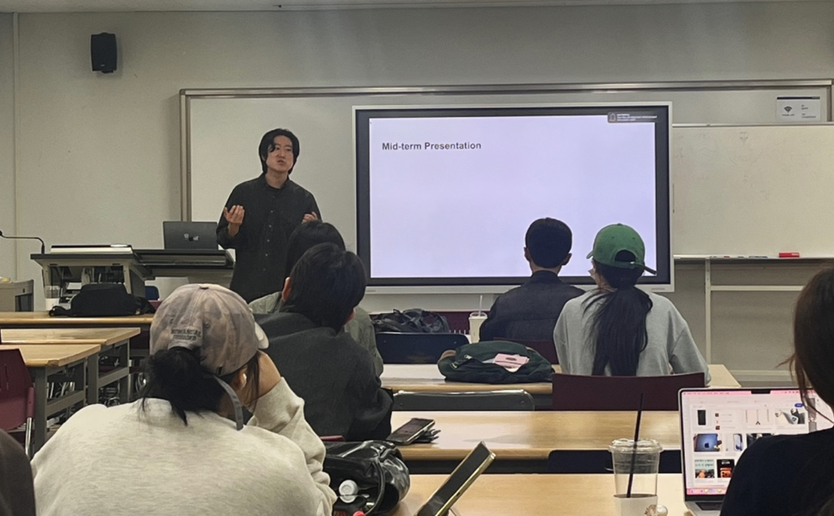 강의실에서는 활발한 토론과 열정적인 프레젠테이션이 이어지고 있으며, 박 연구원은 매주 학생들의 생각을 이끌어내기 위한 다양한 질문과 피드백을 아끼지 않고 있습니다. 특히 중간 발표(Mid-term Presentation) 시간에는 학생들의 개별 주제 발표를 진지하게 경청하며, 각자의 시각을 발전시킬 수 있도록 구체적이고 성실한 피드백을 제공했습니다. 강의 사진에서도 볼 수 있듯이, 그는 차분하면서도 몰입감 있는 강의 스타일로 학생들의 집중도를 높이고, 학문적 깊이와 실무 감각을 동시에 전하고 있습니다.